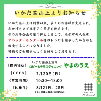 いかだ荘山上は、来年2026年で創業70周年を迎えます。ご愛顧いただいた多くのお客様や、これまで支えてくださった関係者様に感謝の気持ちを伝えるべく、周年企画の一環としてこの夏かき氷に初挑戦しました。