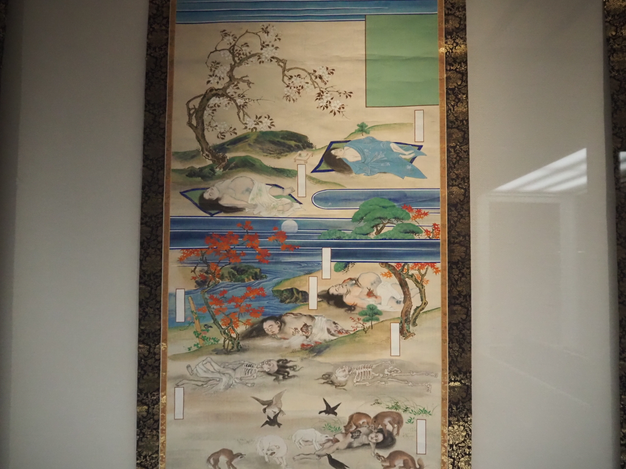 絵には、人の死後の身体の朽ちていく側に春から秋への季節のうつろいを桜や紅葉を用いて表現したものもありました。残酷さと美しさが共存している様子に思わず目を奪われました。他の絵の中でも、探してみてください。