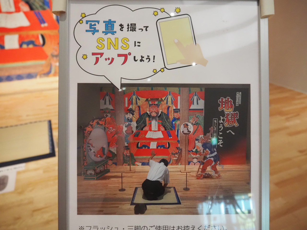 本展のポスターに使用されている閻魔王の「閻魔庁図(津市西来寺所蔵)」をモチーフにした撮影スポットが用意されています。閻魔王に懺悔しているようなポーズをするとこんな写真が撮れます。