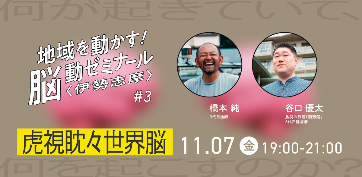 伊勢志摩観光コンベンション機構では、今回取材をした橋本純さん、谷口優太さんをゲストにお迎えする、地域との繋がりを創出する「脳動ゼミナール」伊勢志摩を11月7日(金)に開催します。