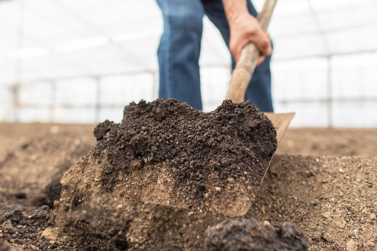 フルーツトマトを栽培する農園へ着くと「2015世界土壌微生物五輪 銀メダル受賞」の看板。「土力」へのこだわりがあるという社長は、トマトが育つハウスの畝に、黒い土のようなものを蒔いている。