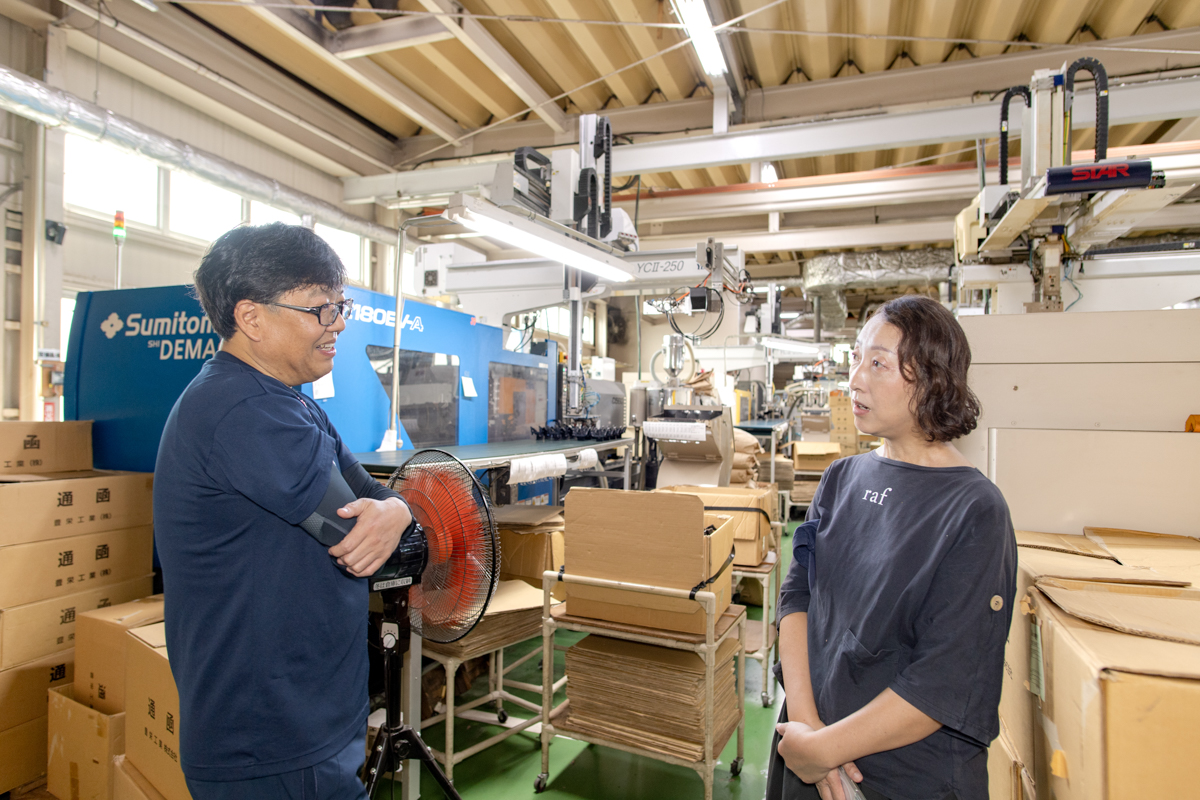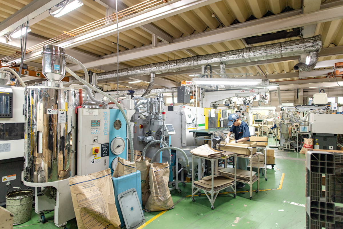訪れたのは山あいにある町工場。主にプラスチックで成形する自動車や住宅の部品を製造している。従業員は約140名。1日に約3トンのプラスチック資材を使い、月曜日から土曜日まで24時間体制で製造している。