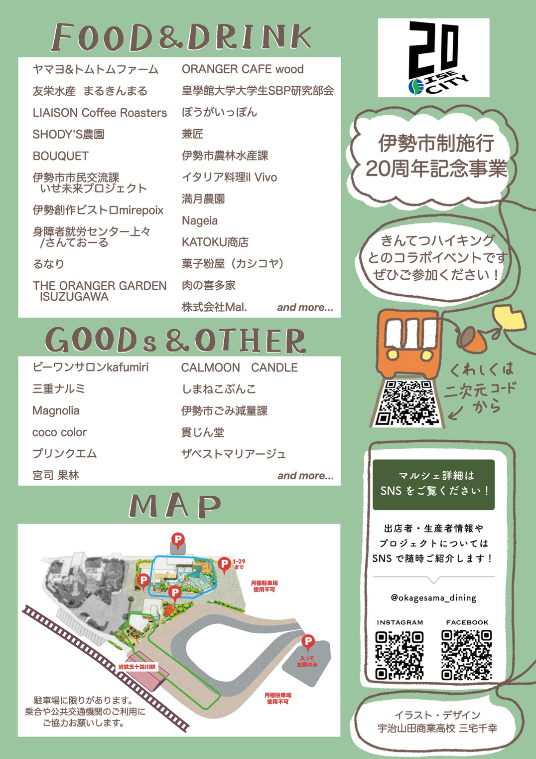 2025年11月30日(日)、第7回「おかげさまマルシェ」を開催します!伊勢創作ビストロmirepoix(ミルポワ)オーナーシェフ岡田新太朗氏や、会場でもある結婚式場ザ・オランジェガーデン五十鈴川のシェフが、地域食材を使用したメニューをご提供!他にも地域の人気店の出店や、生産者による食材の直売などもお楽しみいただける、食を中心としたマルシェです。環境と体にやさしい食、ワークショップでの体験など、子どもから大人までお楽しみいただけます! 近畿日本鉄道株式会社様による「きんてつハイキング」とのコラボ開催により、近鉄五十鈴川駅前にもエリア拡大!駅前にキッチンカーがやってくるほか、伊勢市制施行20周年記念事業の一環として、市内の農林水産物が大集合!駅前でのテント出店も賑やかです。