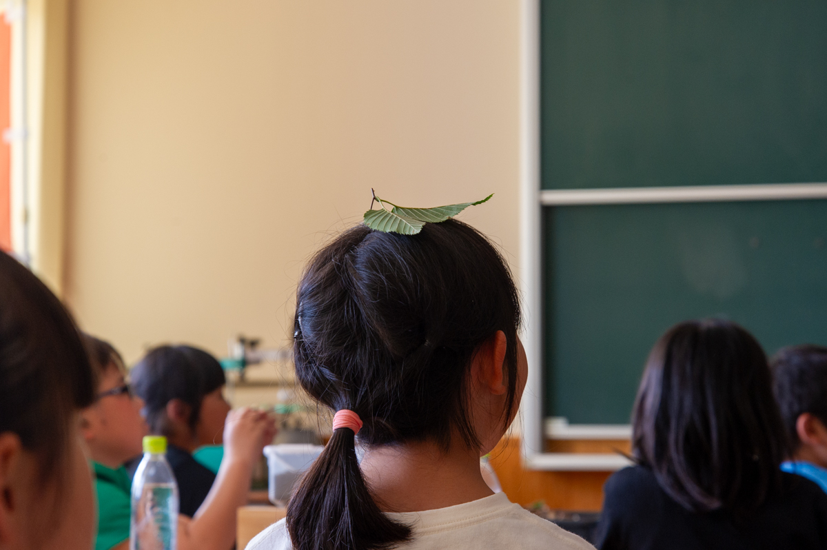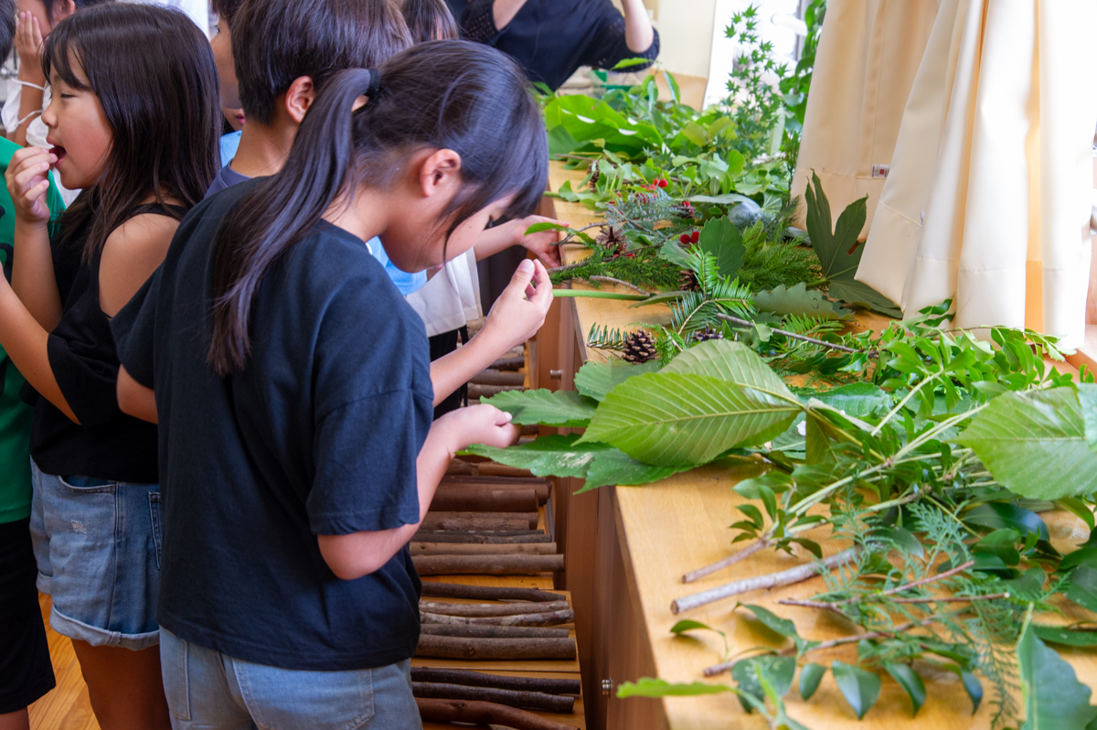 教室には山のさまざまの木々や葉っぱ、ヤマモモの実を食べて笑顔になる子どもたち。