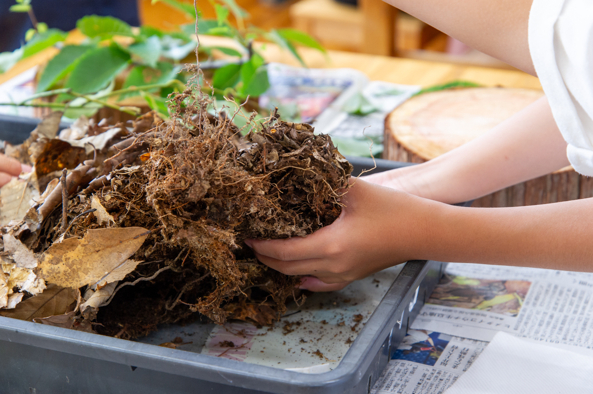 続いて、実際に山にある土。ふわふわの触感を手で確認。