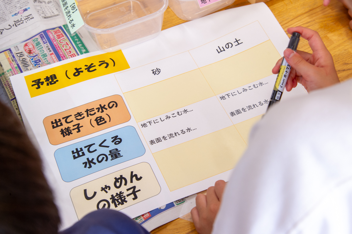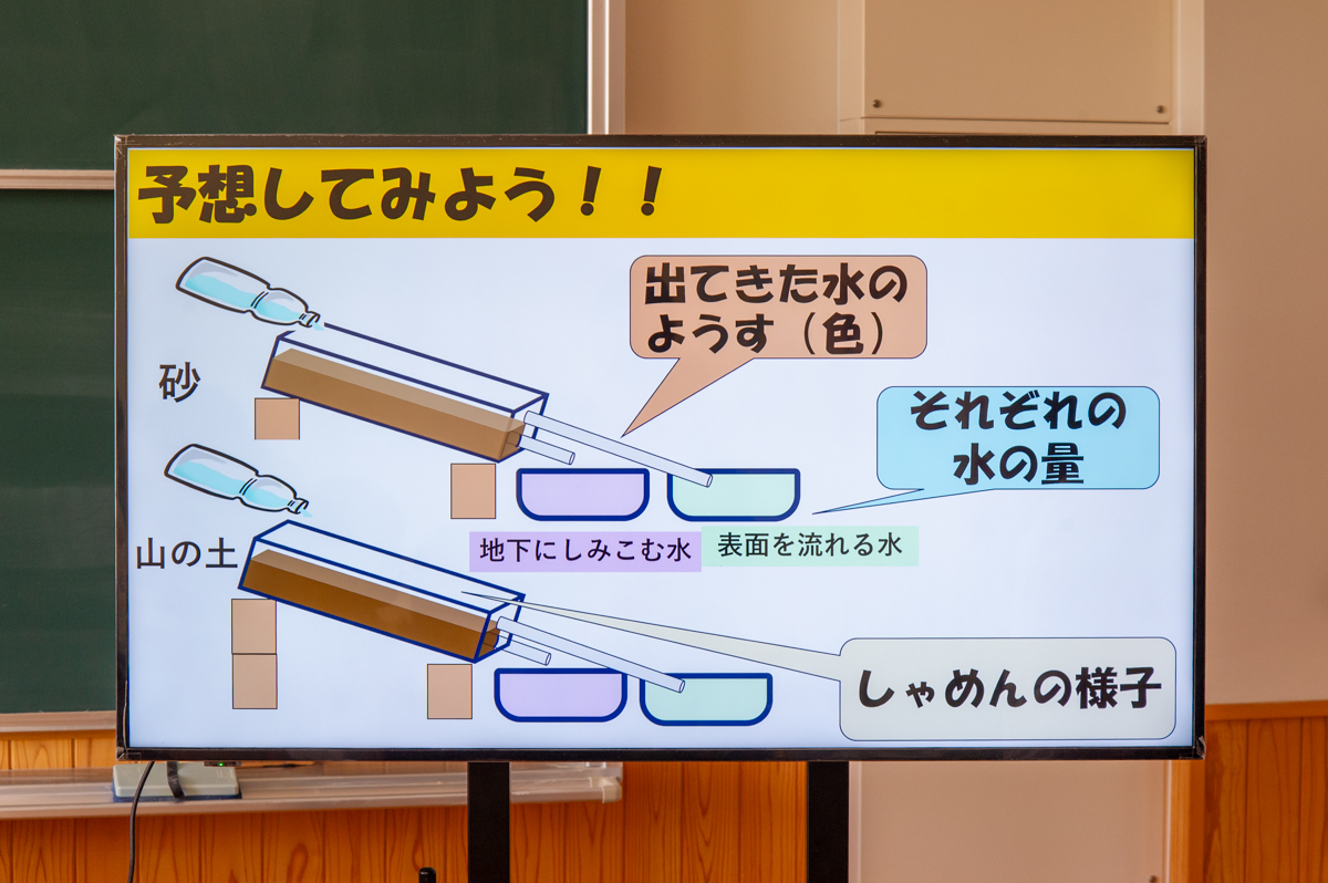 それぞれに雨に見立てた水を注ぐと、どのような水が流れ出るでしょうか?