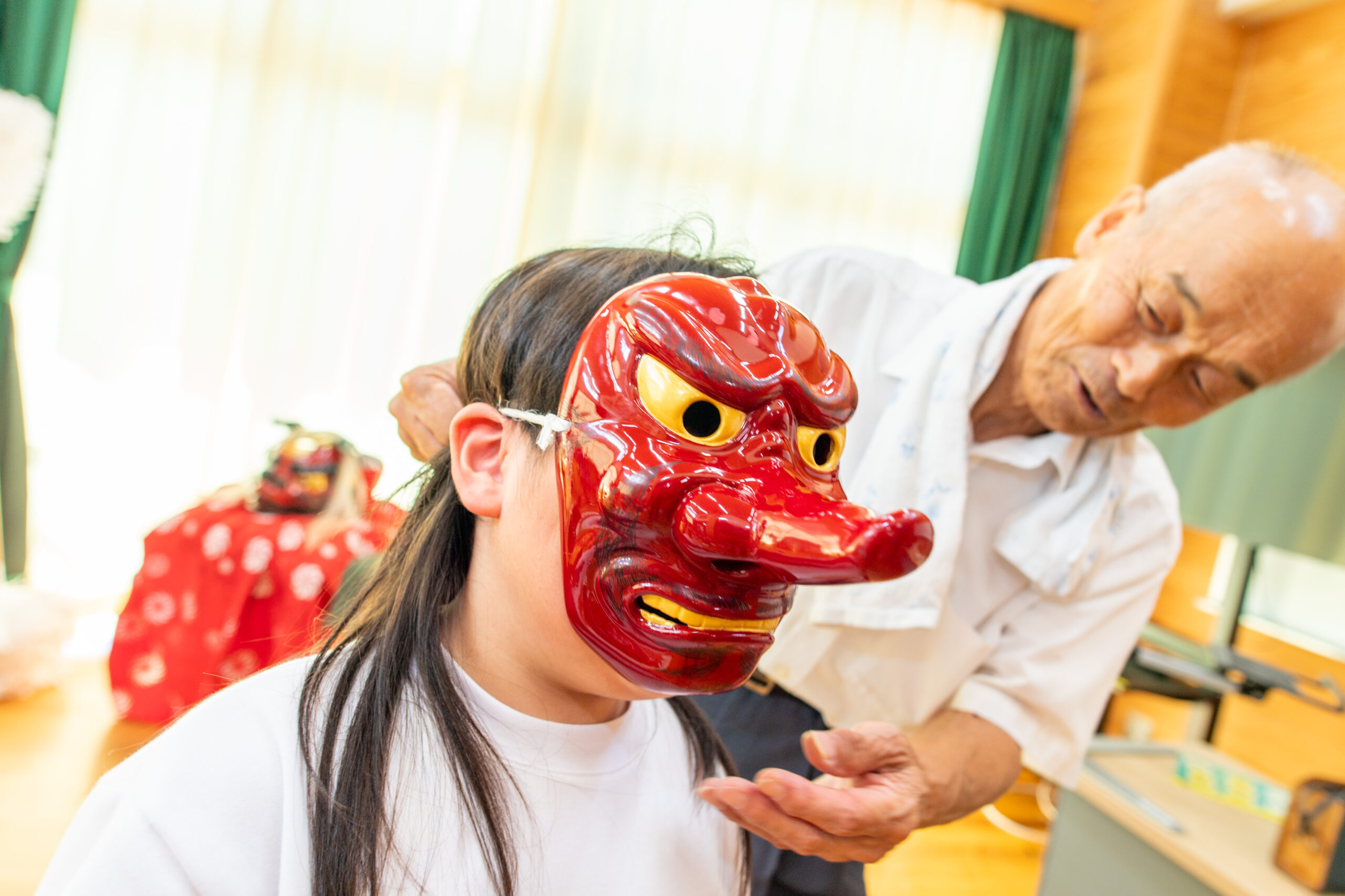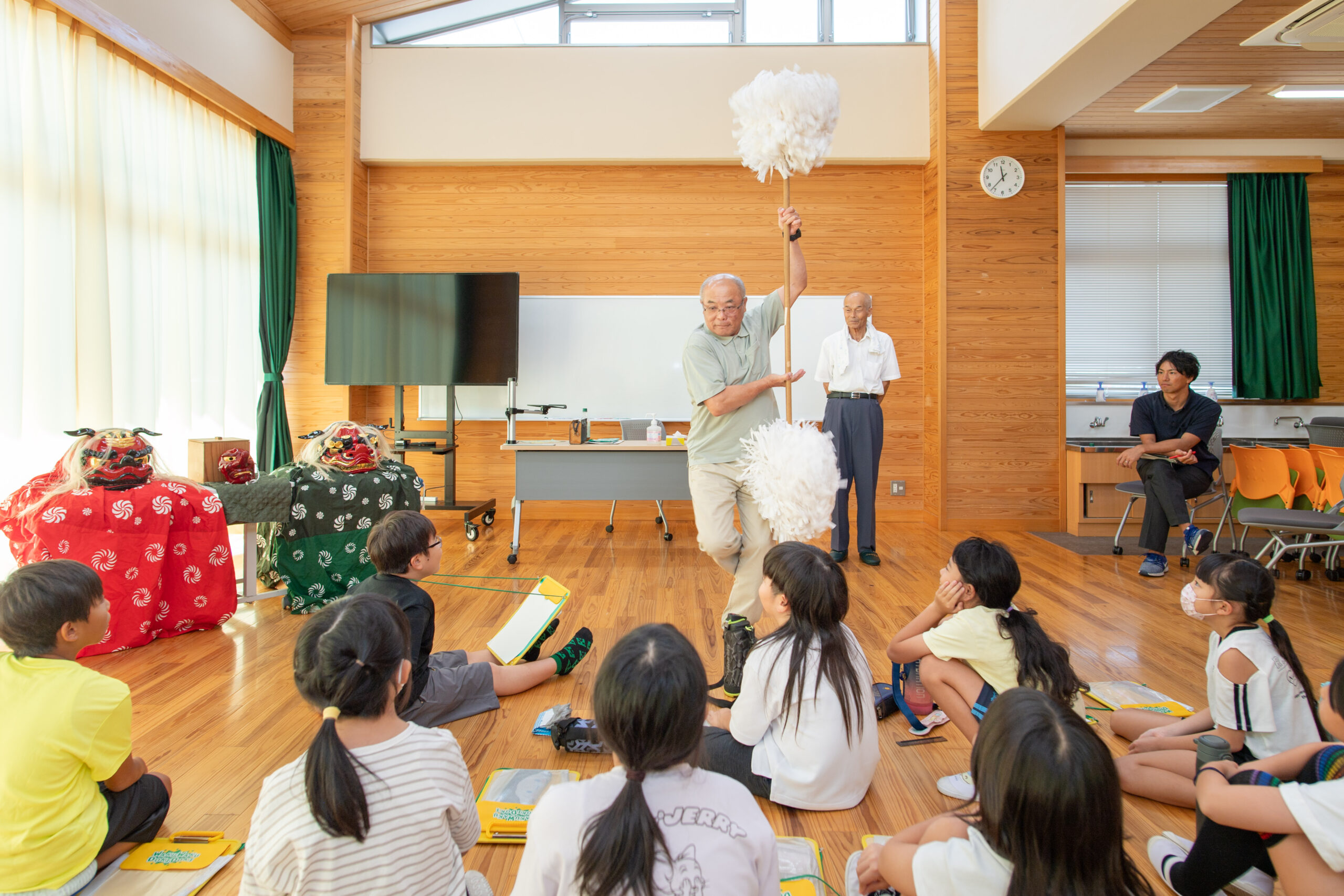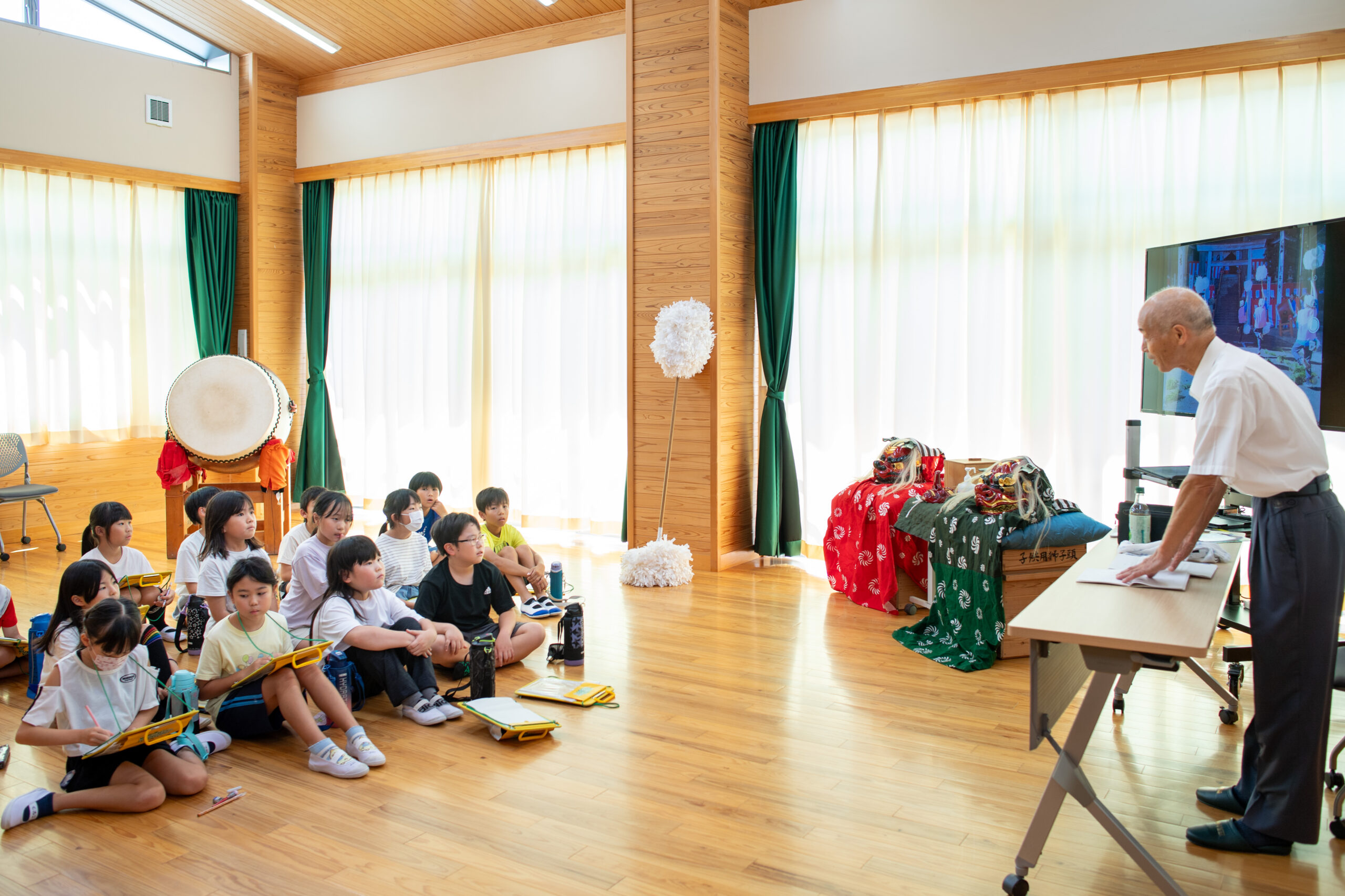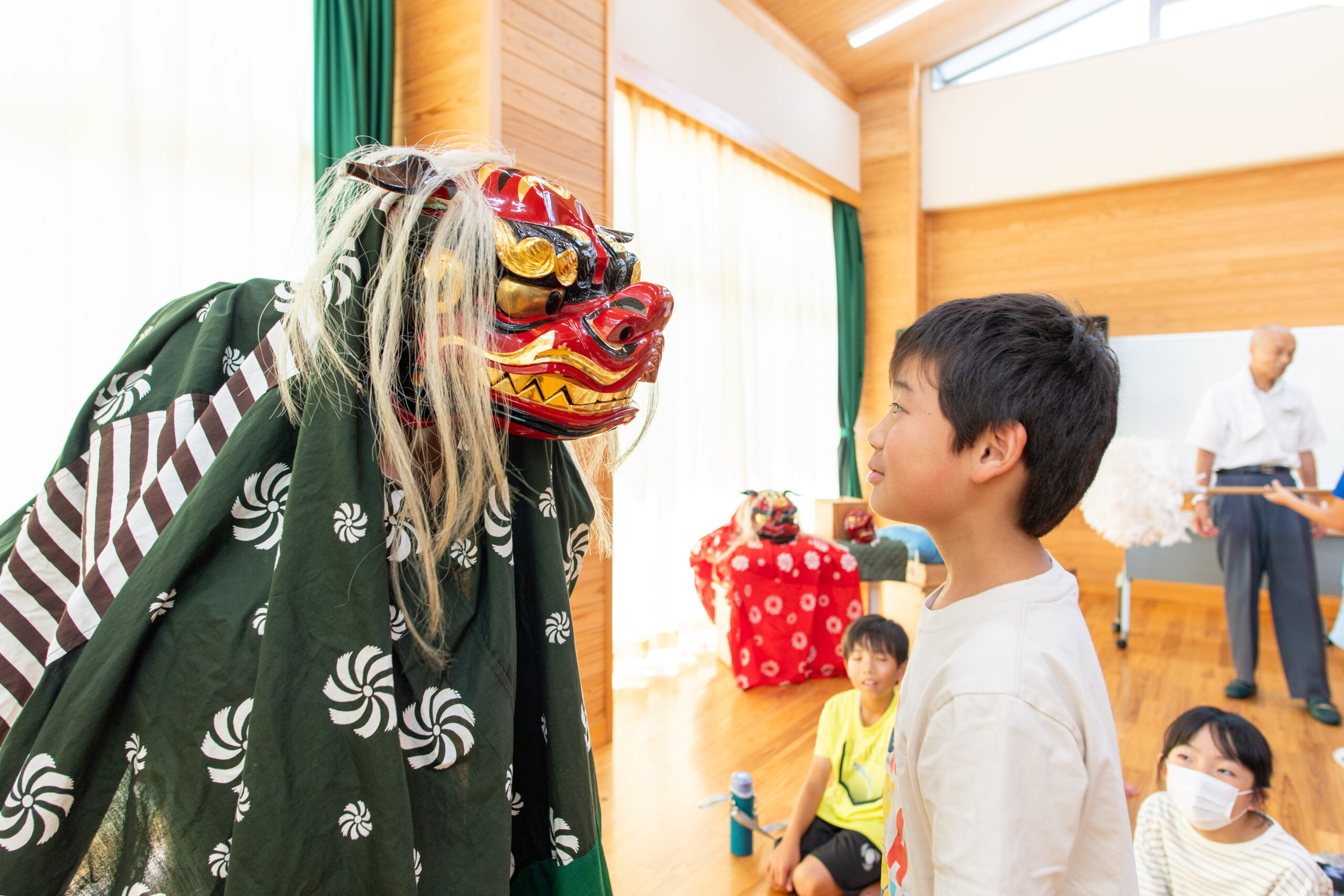「てんてん」で使う実物の天狗のお面、獅子、太鼓に触れる子どもたち。地域学習の授業を終えた高橋さんにお話を聞いた。