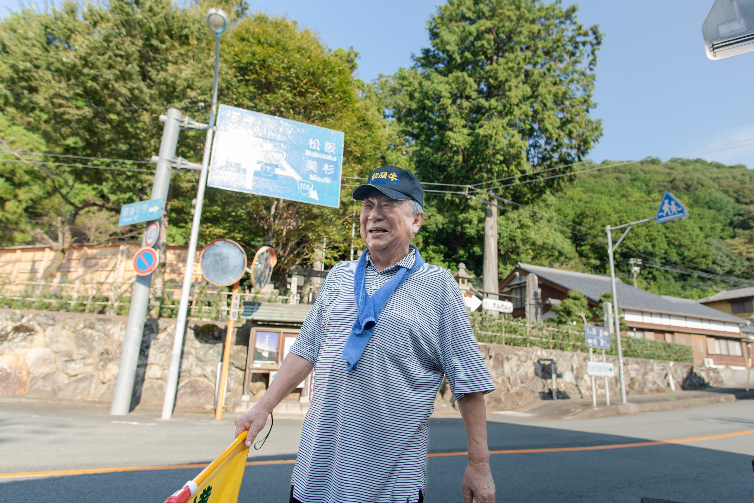 粥見神社の前で見守り活動を行っているのは、地元の大久保さん。小学生だけでなく中学生も大きな声で大久保さんとあいさつを交わす。