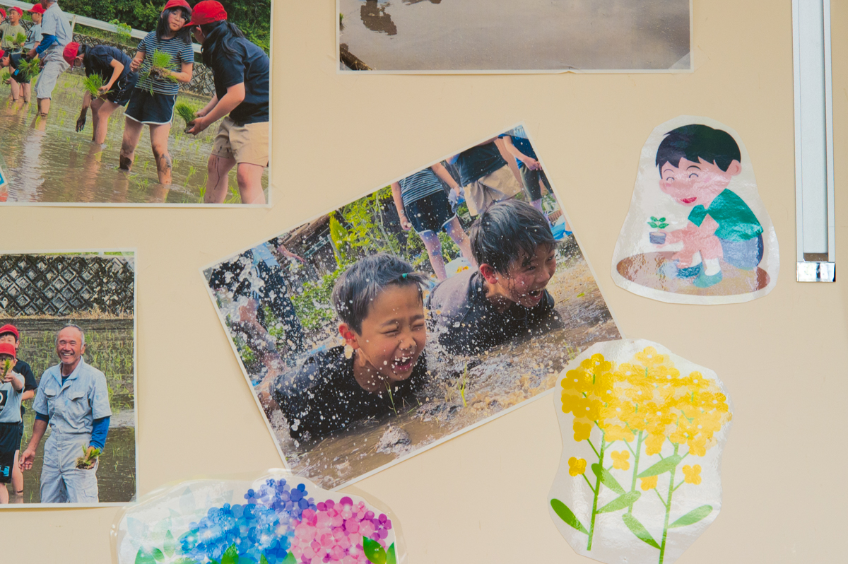 米づくりの授業では、餅米の苗を手作業で田植え。水田に飛び込む子どもたちもいる田んぼは時代を超えた遊び場だ。収穫した餅米は、地元の菓子店・甲子軒さんと一緒におはぎを作って食べる。