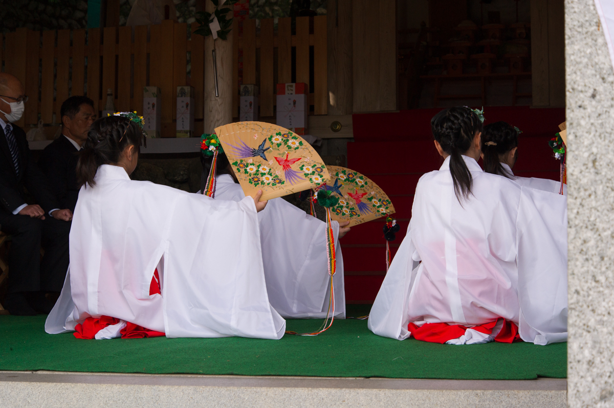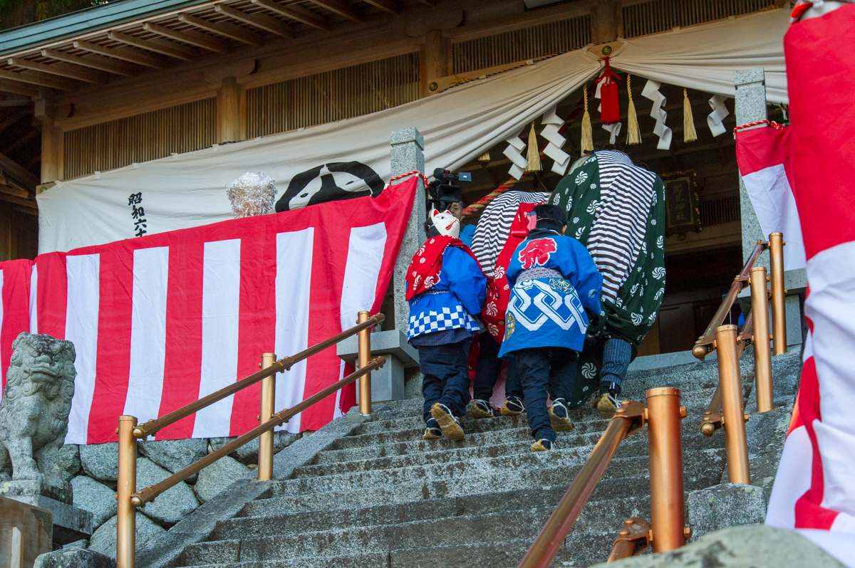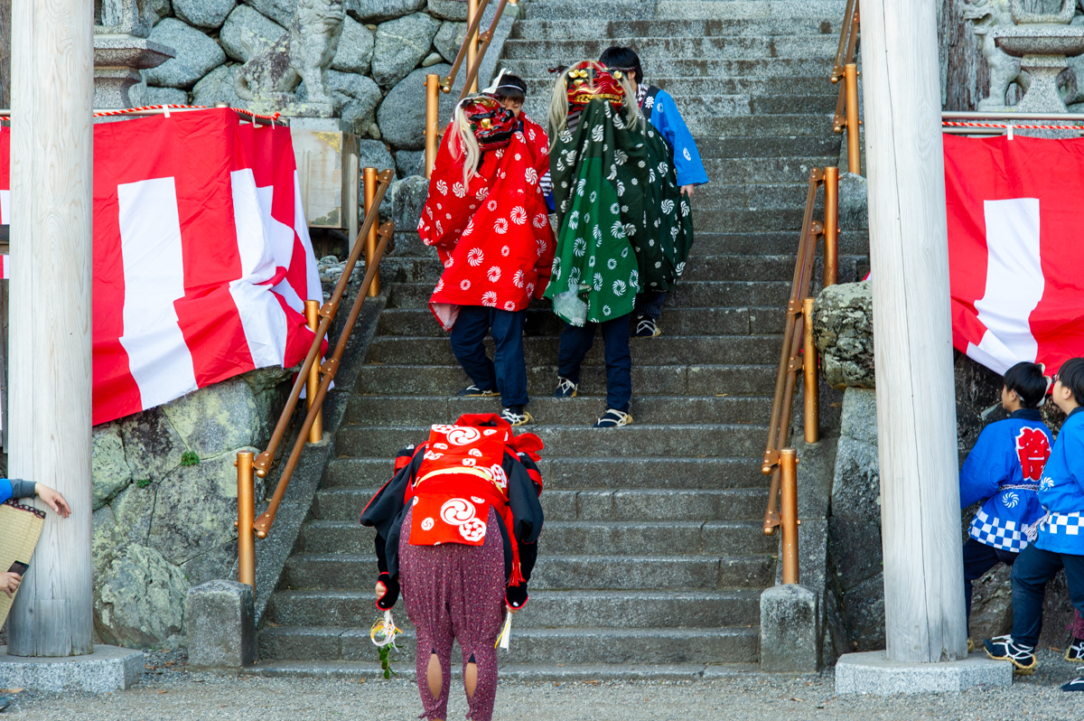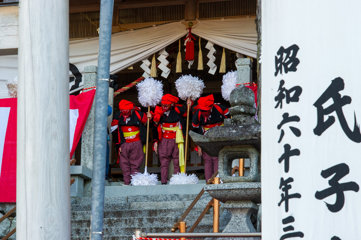 ハナカケ役の子どもたちが、拝殿から太鼓に合わせてゆっくりと降りてくる。