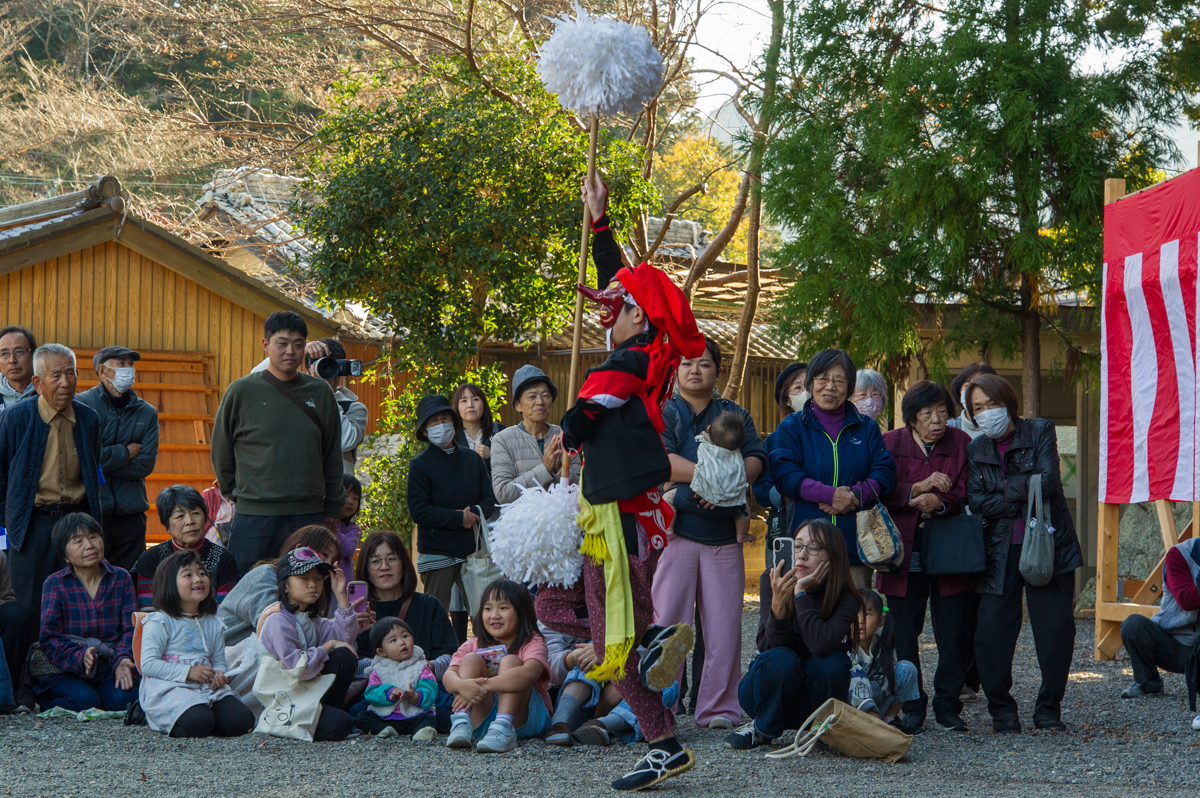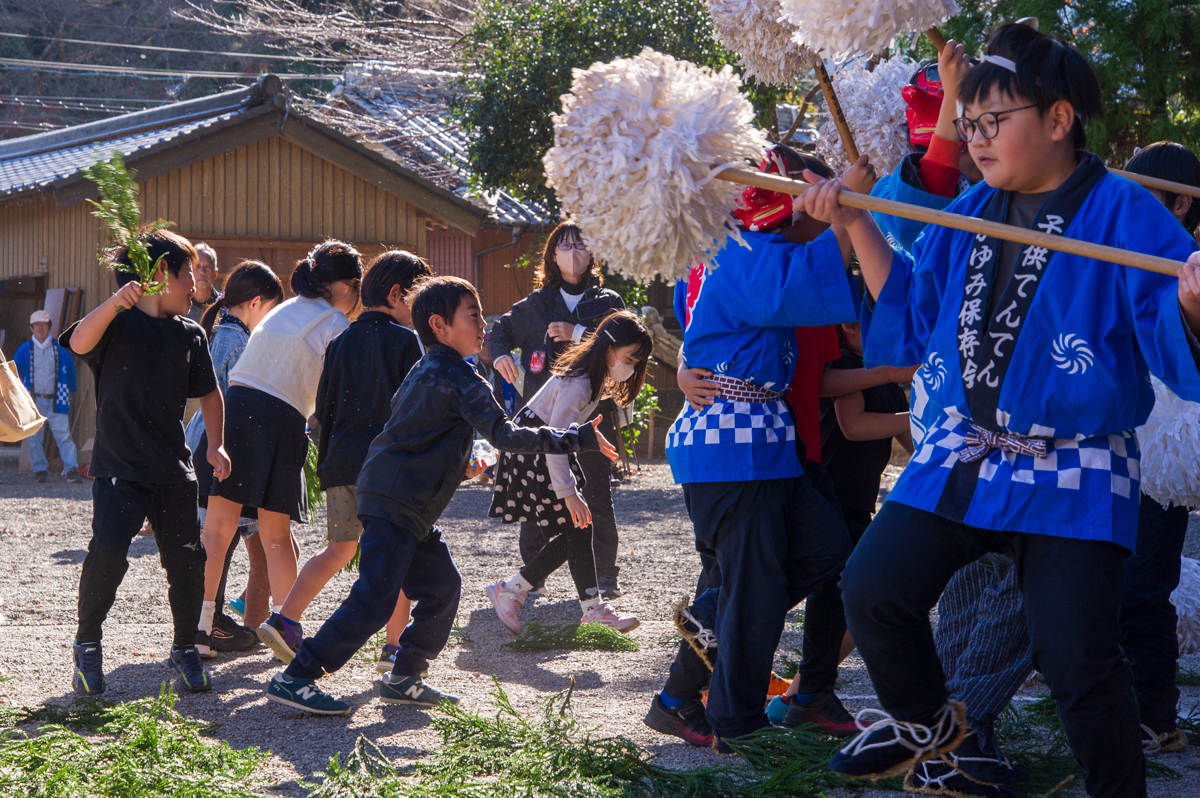 見物していた子どもたちが、ハナカケを目掛けてスギの葉を投げつける。これは地上界が荒れている様子を表現しているそう。