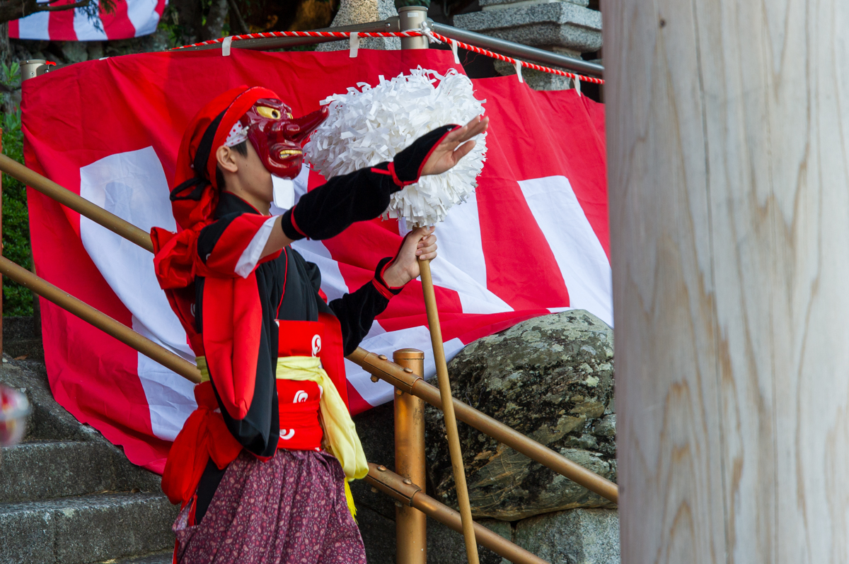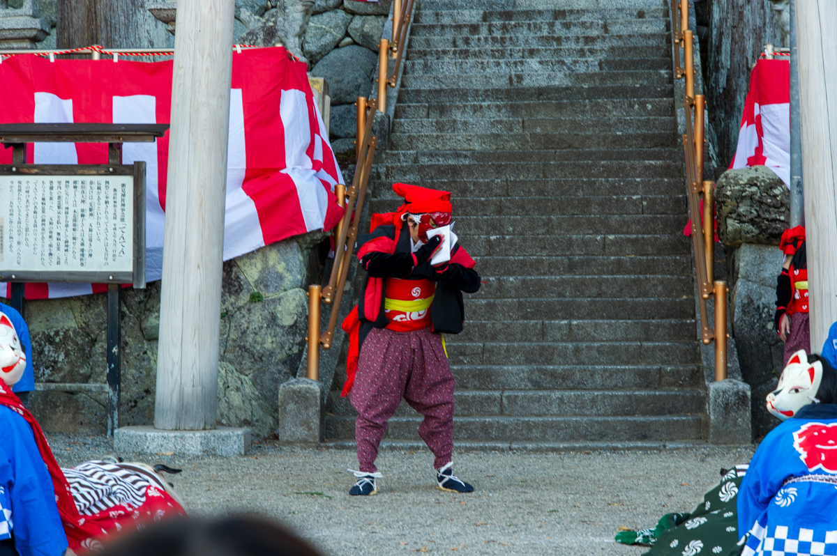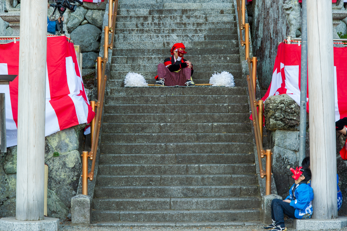 松阪市の山間のまち、飯南町の粥見(かゆみ)神社で行われた「子どもてんてん」のひと幕。「子どもてんてん」は小学4年生から6年生の子どもたちが行う神事だ。天狗は太鼓の音色に合わせて踊りながら、ゆっくりゆっくりと階段を降りる。写真は演舞の途中、居眠りの演技をしているシーン。しかし、鳥居に腰を掛けている別役の子ども天狗は、待ちくたびれて本当に眠ってしまった様子。