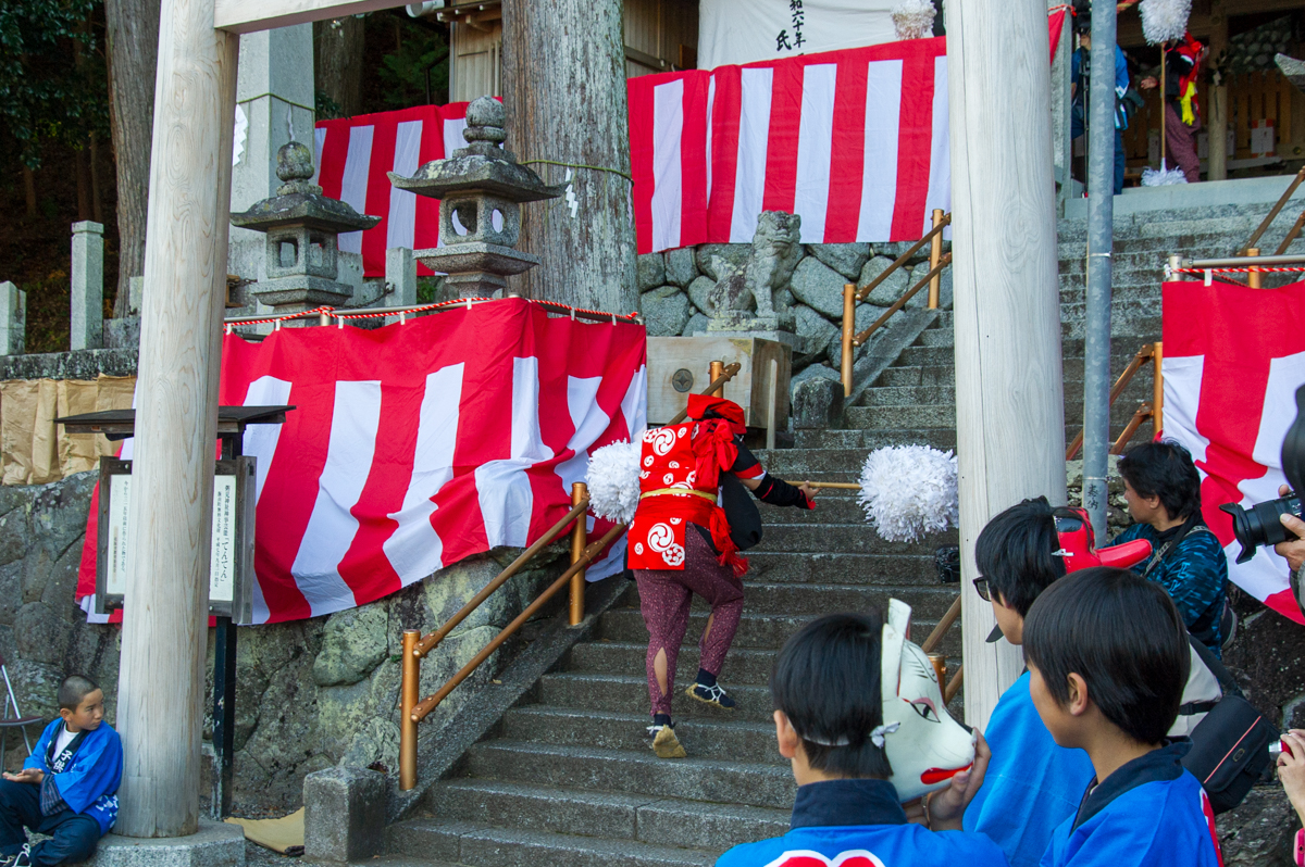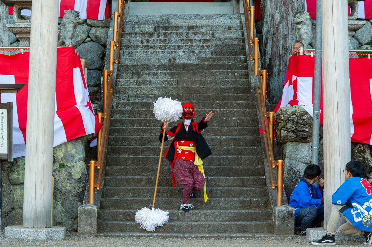 大人が行う「てんてん」は約700年続く粥見神社の春季例大祭の神事。秋の大祭では、20数年前から伝統の継承のため「子どもてんてん」が行われている。天狗はいわば主役であり、子どもたちの憧れの存在でもあるという。