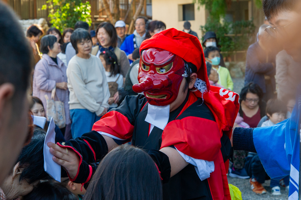 鼻をかんだ紙を頭につけてもらうと、無病息災という珍しい神事。ちなみに天狗役の子どもはお面の目の部分ではなく、鼻の穴から視界を確保しているため、前がほとんど見えていない。