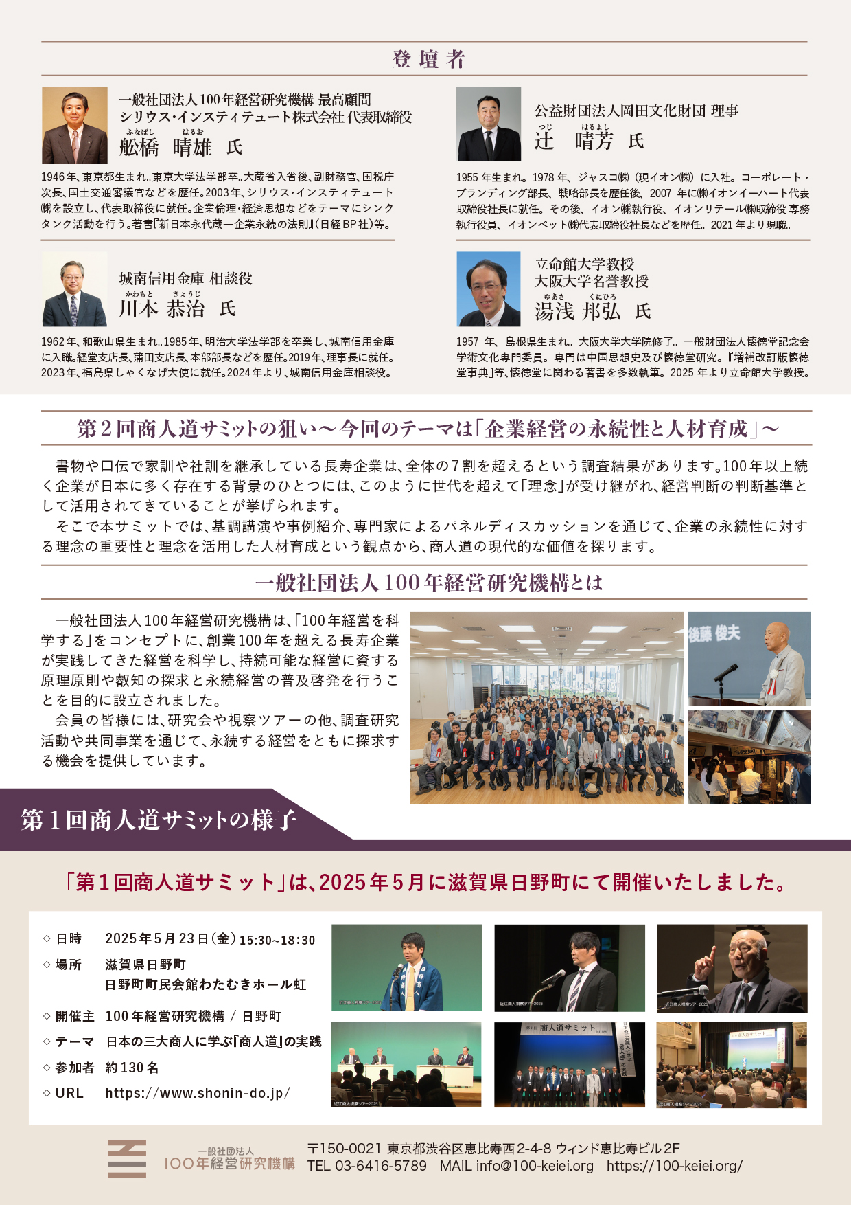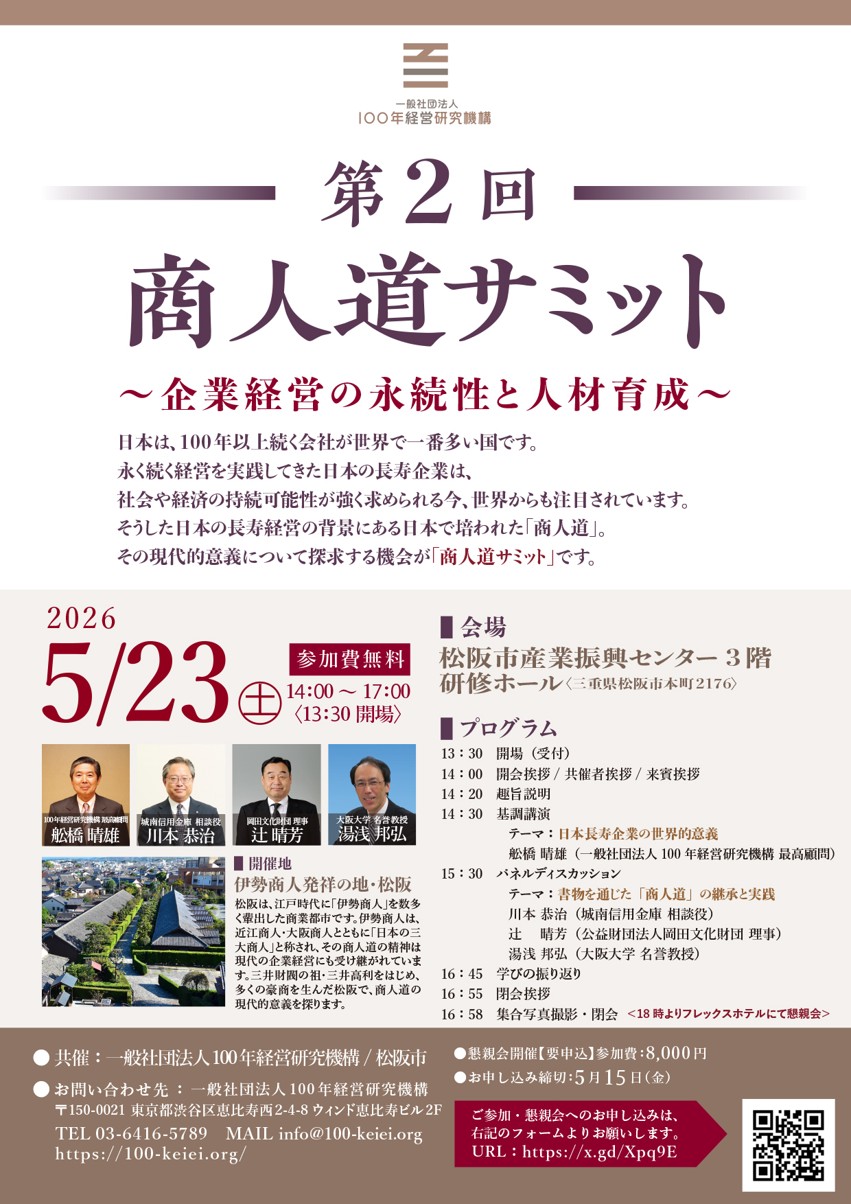 2026年5月23日(土)、三重県松阪市にて、「企業経営の永続性と人材育成」をテーマに、第2回商人道サミットを開催いたします。
