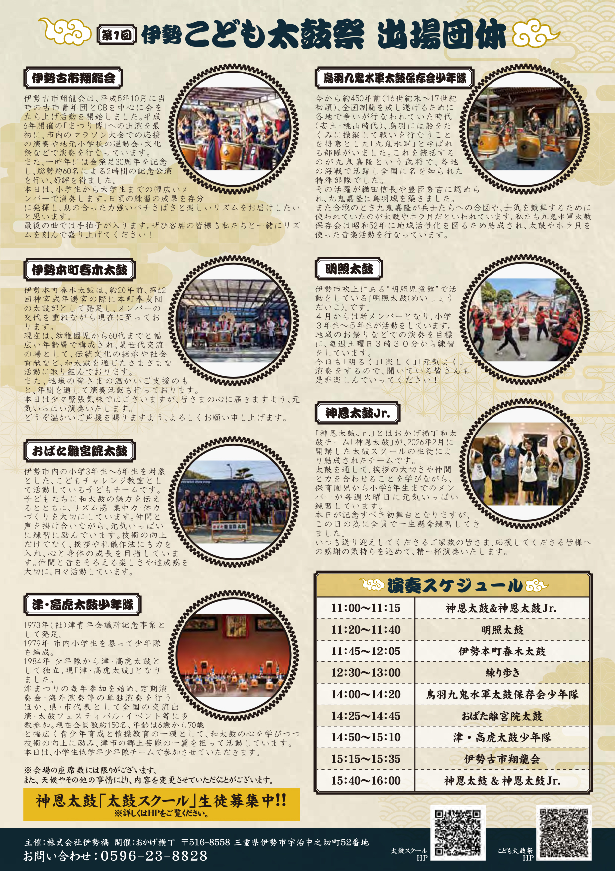 出演団体/明照太鼓(伊勢)、伊勢古市翔龍会(伊勢)、おばた離宮院太鼓(伊勢)、伊勢本町春木太鼓(伊勢)、津・高虎太鼓少年隊(津)、鳥羽九鬼水軍太鼓保存会少年隊(鳥羽)、神恩太鼓Jr.(伊勢)