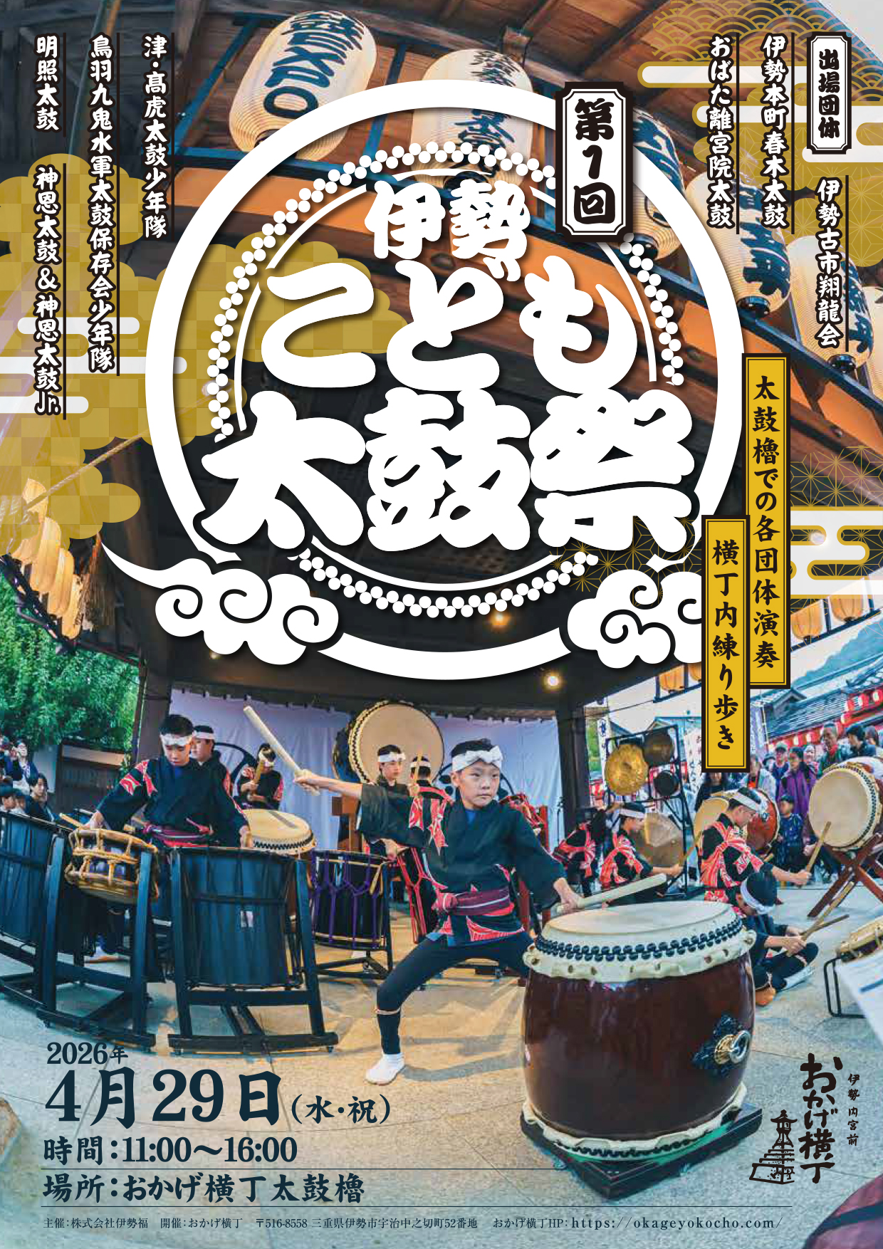 おかげ横丁では、「第1回 伊勢こども太鼓祭」を初開催いたします。 本催しは、子どもの日を前に、伊勢および近隣地域で活動する太鼓チームの子どもたちが一堂に会し、日頃の練習の成果を披露する“初開催”の催しです。地域に根ざした太鼓文化のさらなる発展と次世代への継承を図るとともに、伊勢・おかげ横丁を訪れる多くの国内外の観光客の皆さまに、その魅力を広く披露することを目的としています。 また、神恩太鼓の太鼓スクール生によるチーム「神恩太鼓Jr.」にとっては、本イベントが初披露の場となります。 当日は、おかげ横丁・おはらい町通りにて出演者による練り歩きも実施予定で、来場者の皆さまに迫力ある演奏を間近でお楽しみいただけます。